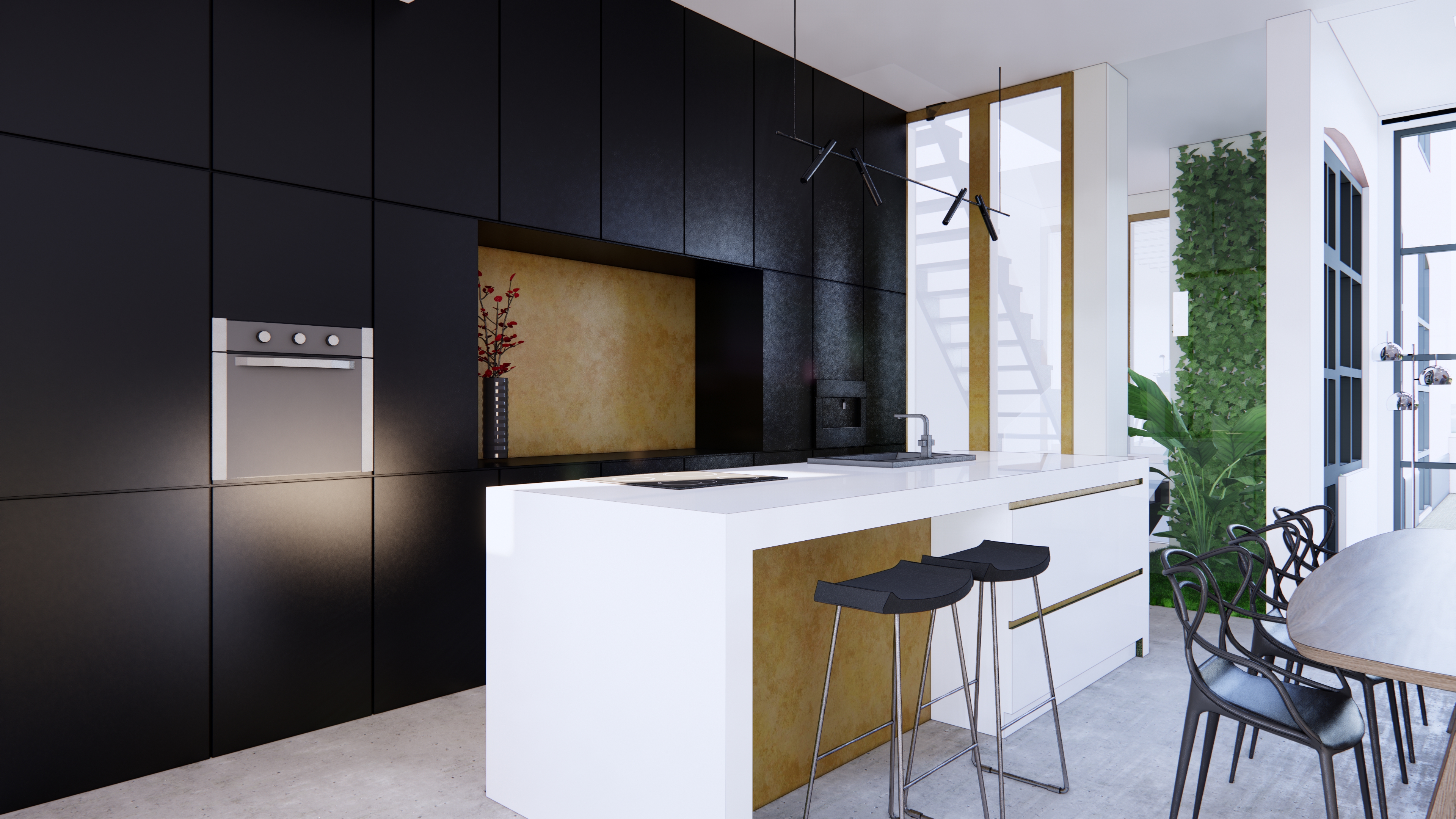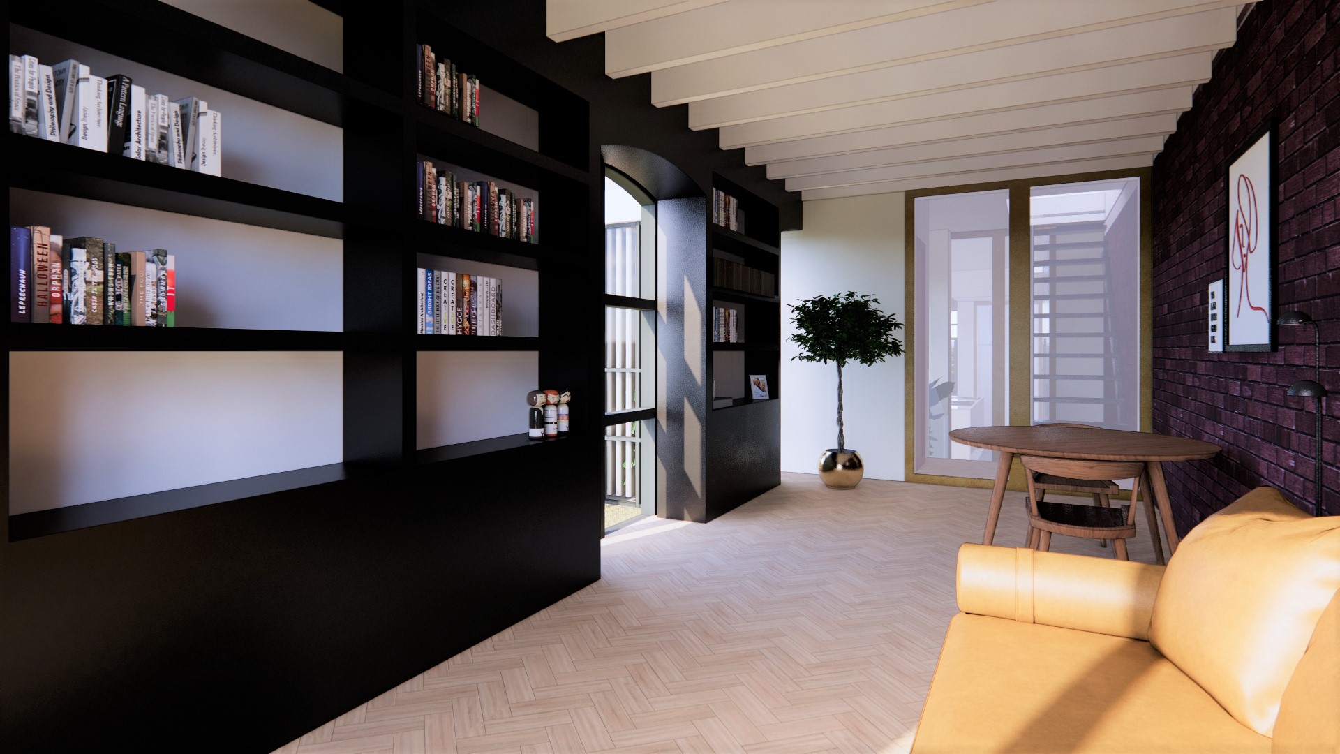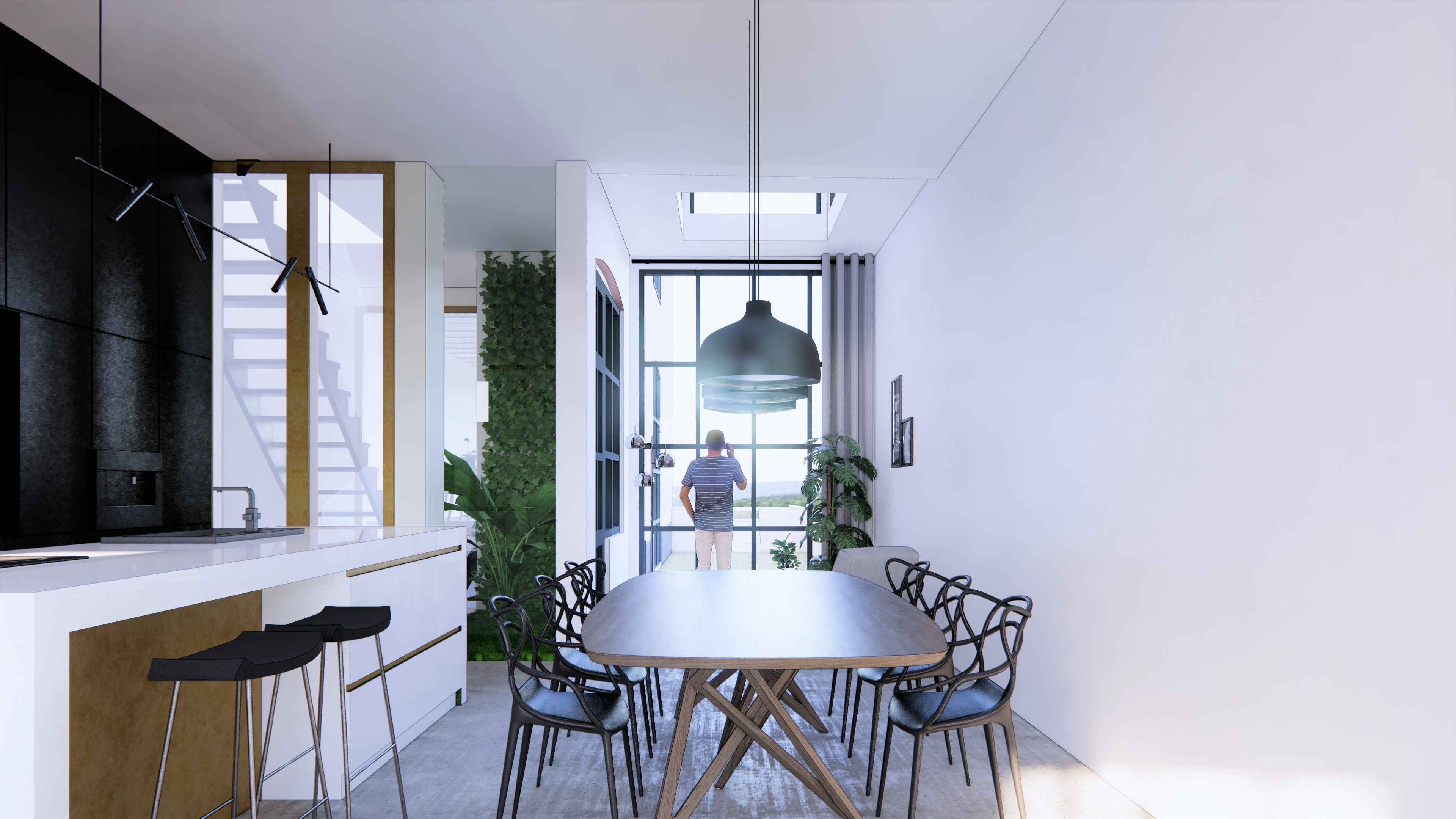 Deze haveloze benedenwoning wordt omgetoverd tot een duurzame, minimalistische parterrewoning. Door een deel van de woning op te splitsen in een Souterrain en Bel- etage is er meer oppervlak gecreëerd en door het trappenhuis als split level te laten dienen, kan bij binnenkomst 23 meter diep door de woning worden gekeken.