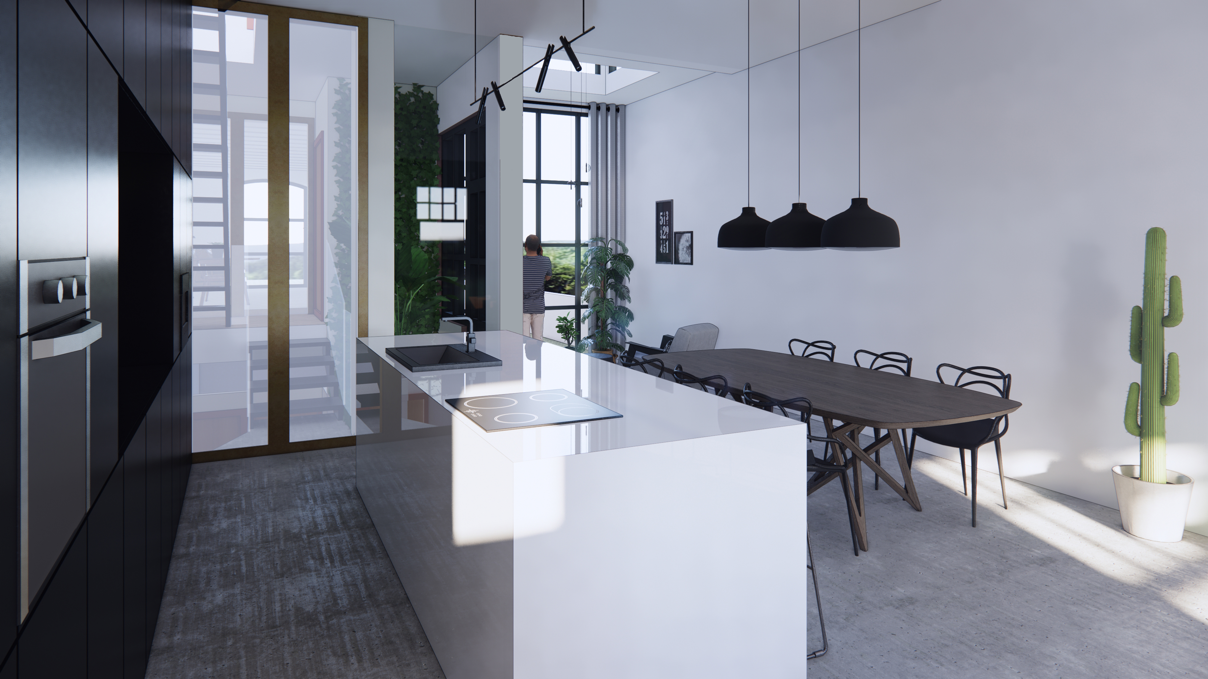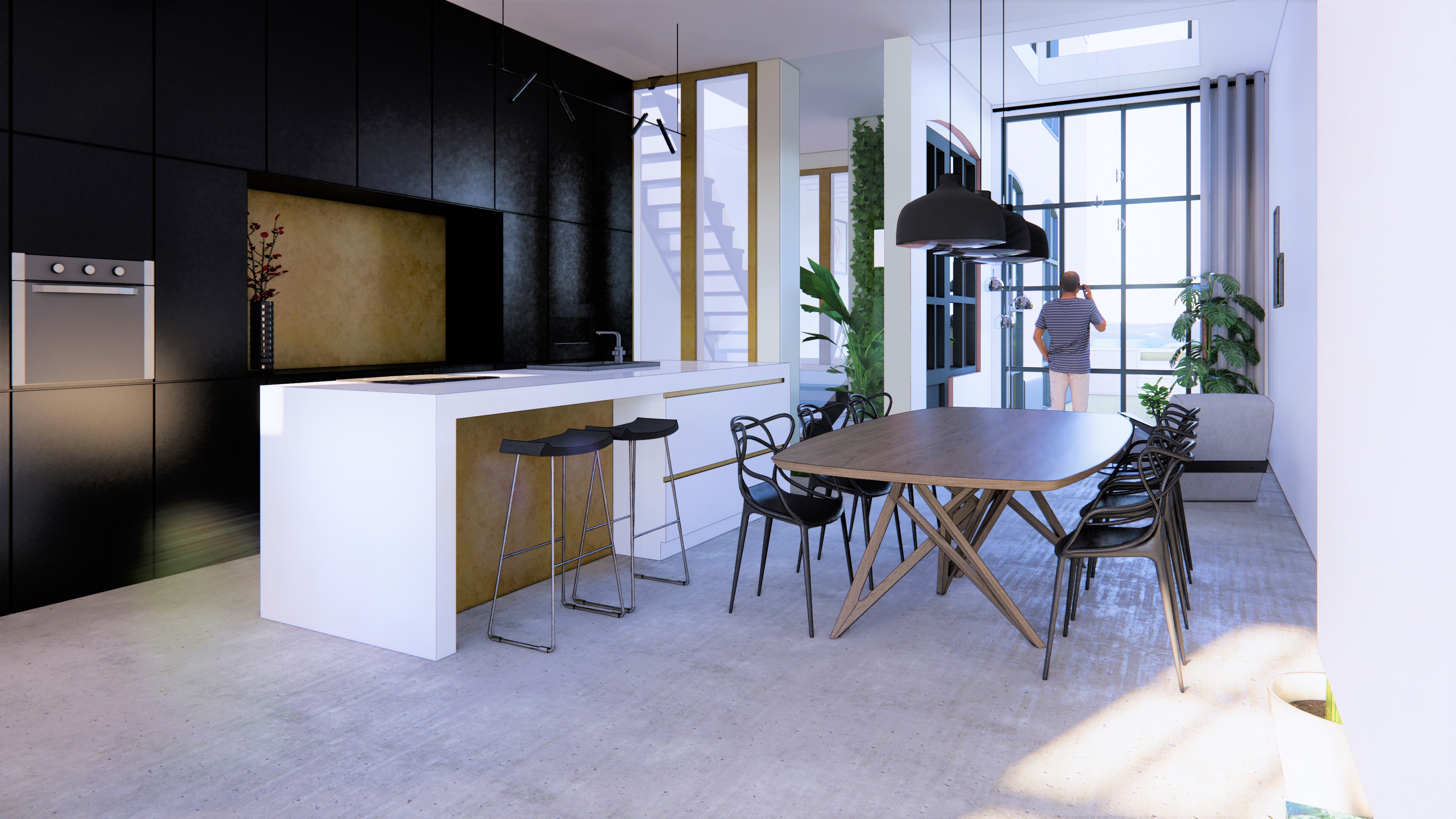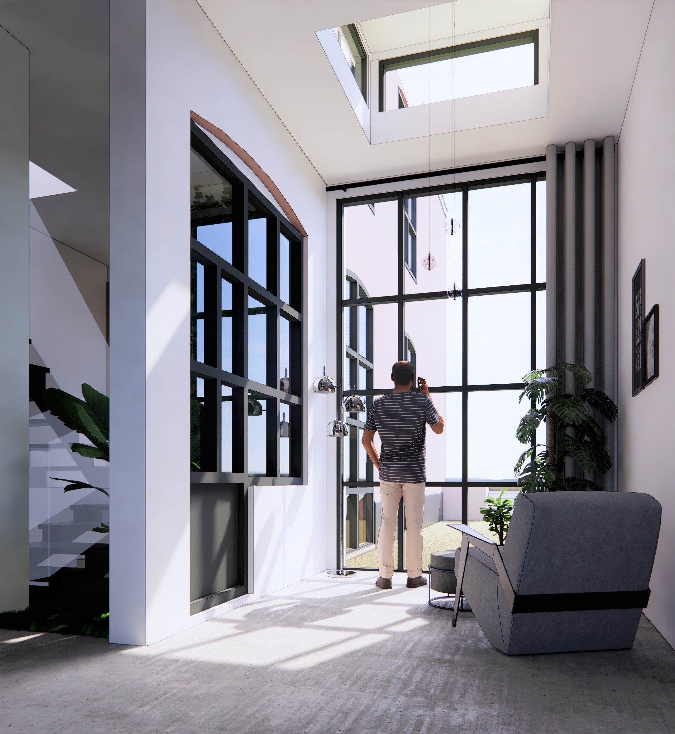 Deze haveloze benedenwoning wordt omgetoverd tot een duurzame, minimalistische parterrewoning. Door een deel van de woning op te splitsen in een Souterrain en Bel- etage is er meer oppervlak gecreëerd en door het trappenhuis als split level te laten dienen, kan bij binnenkomst 23 meter diep door de woning worden gekeken.